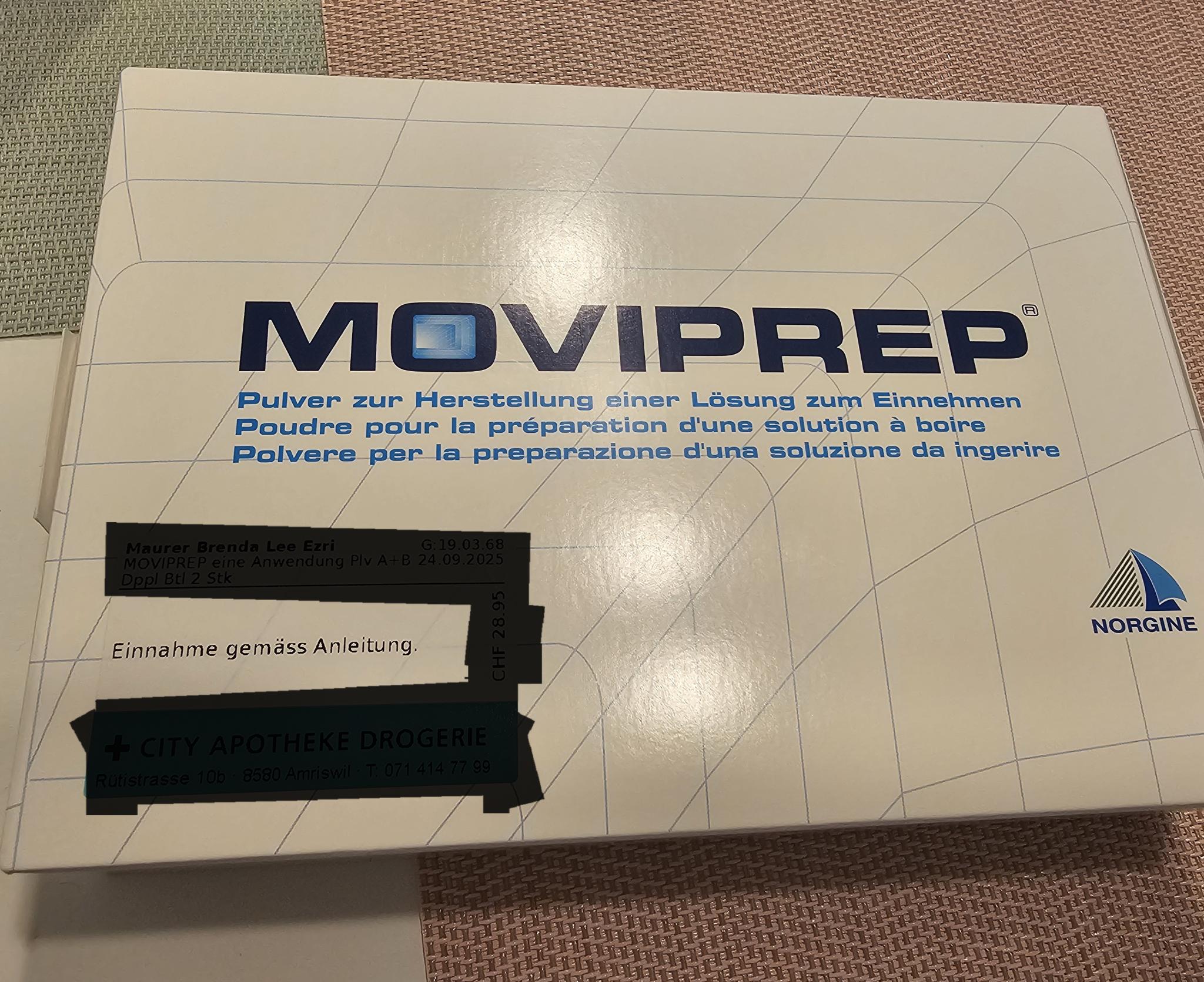 Montag hatte ich nur Eierpfannkuchen und Abends dann Moviprep. Ich sollte es aufteilen. Montagabend ein Liter und heute morgen den zweiten Liter bis 07:00Uhr.