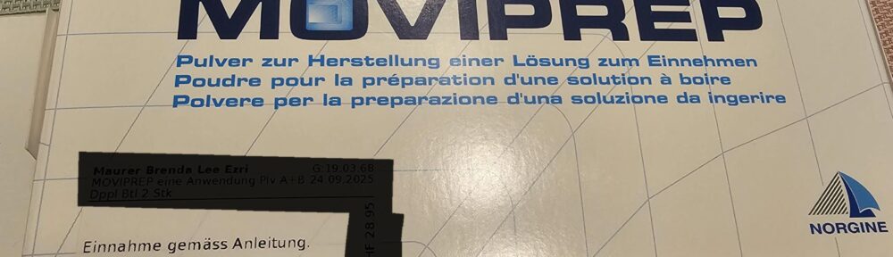 Montag hatte ich nur Eierpfannkuchen und Abends dann Moviprep. Ich sollte es aufteilen. Montagabend ein Liter und heute morgen den zweiten Liter bis 07:00Uhr.